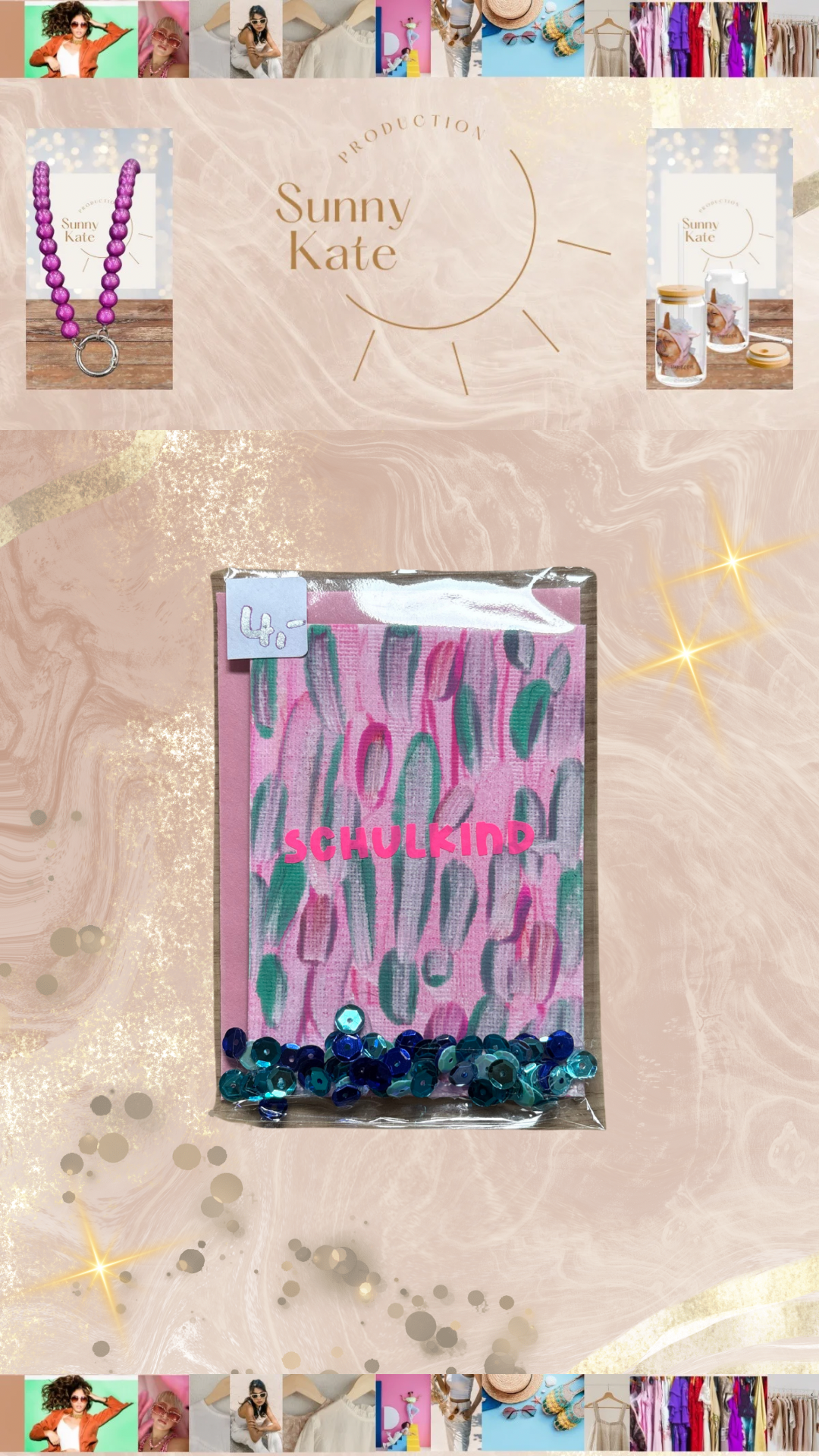 Das fröhliche Design in Pink-, Grün- und Violetttönen wurde von Hand gemalt und liebevoll verarbeitet. Verziert mit funkelnden Pailletten und dem Schriftzug „Schulkind“ ist es das perfekte kleine Geschenk zur Einschulung oder als Überraschung zwischendurch.