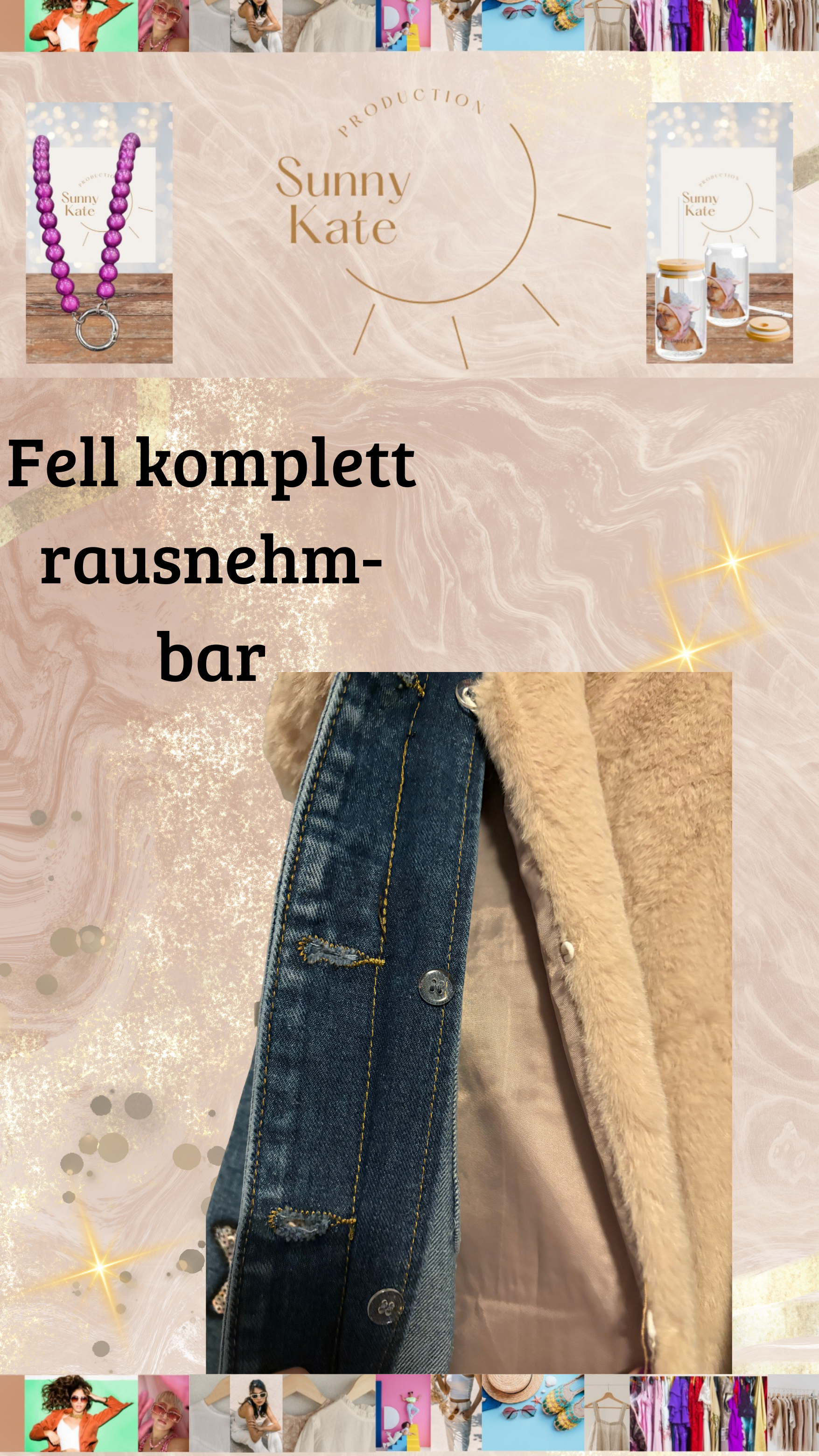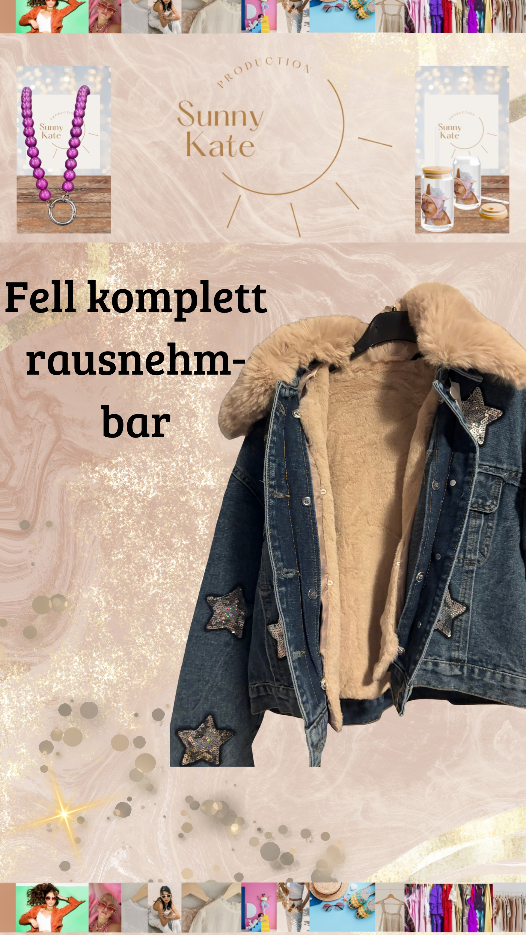 Trendige Jeansjacke Damen Oversize, kuschelweich gefüttert, mit funkelnden Sternen & abnehmbarem Fellkragen. One Size (36–42).