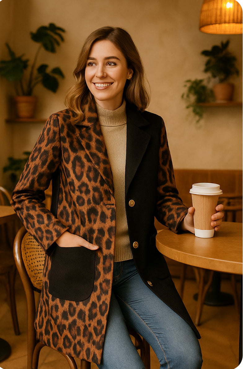 Der „Wild Elegance Coat“ ist die perfekte Mischung aus Eleganz und wilder Attitüde. Mit seinem auffälligen Leopardenprint in Kombination mit klassischem Schwarz setzt er ein starkes Fashion-Statement.